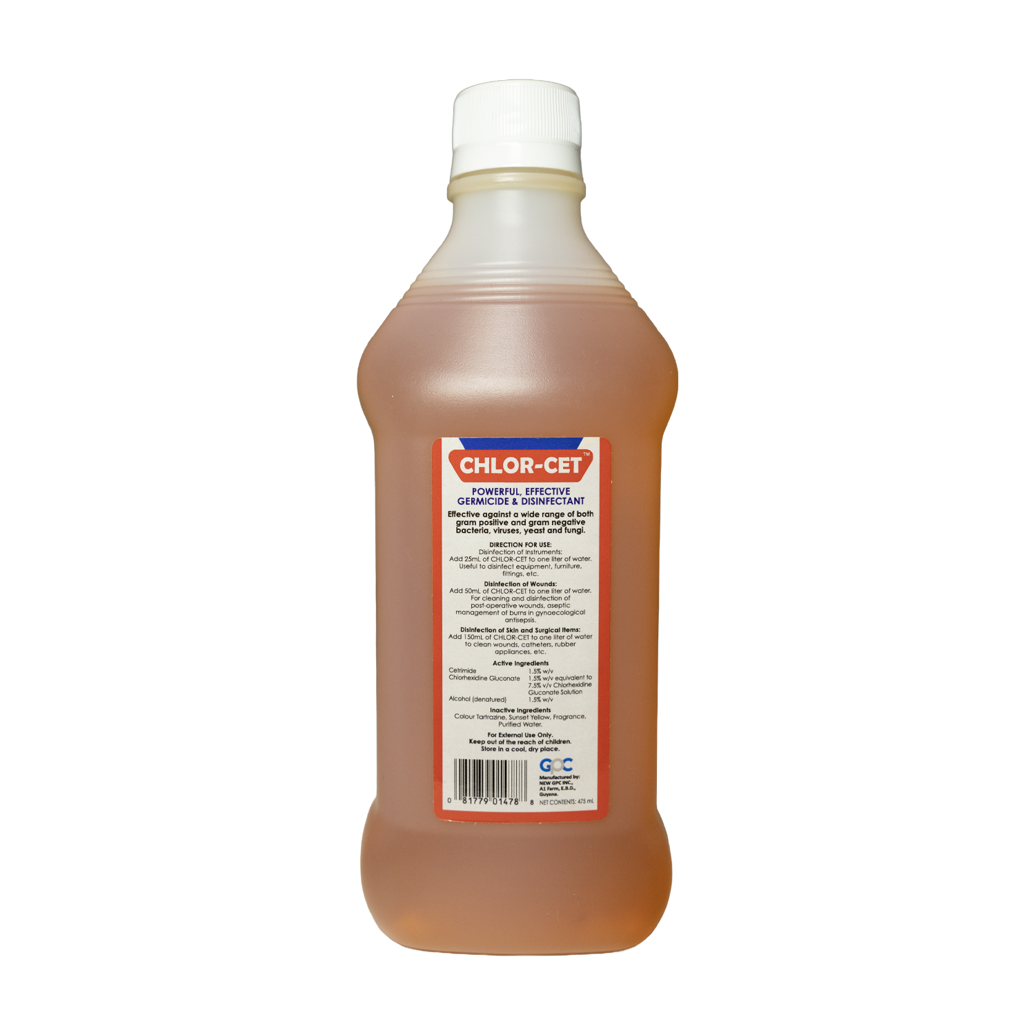 | Direction | For external use only. Disinfection of Instruments: Add 25 mL of Chlor-Cet to 1 L of water Disinfection of Wounds: Add 50 mL of Chlor-Cet to 1 L of water and apply to the affected area. Disinfection of Skin and Surgical Items: Add 150 mL of Chlor-Cet to 1 L of water |